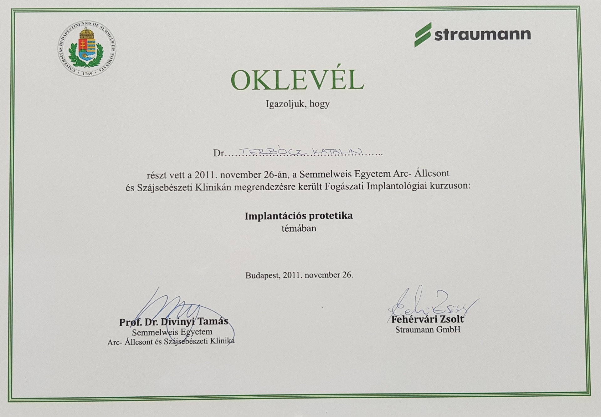 Universitätsklinik SEMMELWEIS Budapest - 2011. Zahnmedizinische Diplom, SEMMELWEIS